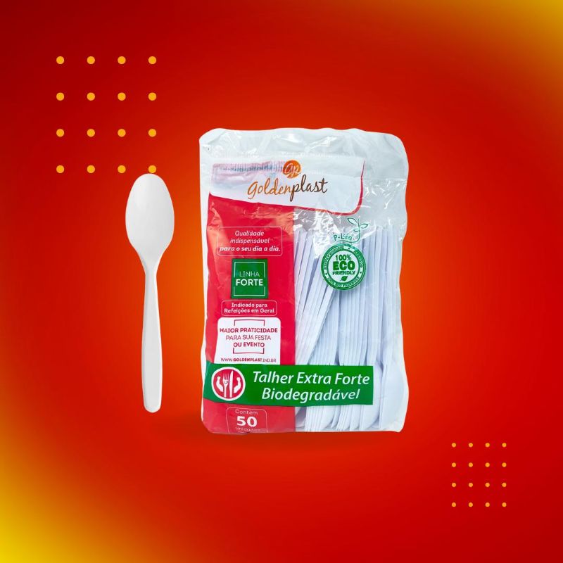 A colher Goldenplast (pacote com 50 unidades) é um talher extra forte e biodegradável, ideal para oferecer resistência e sustentabilidade no dia a dia.
